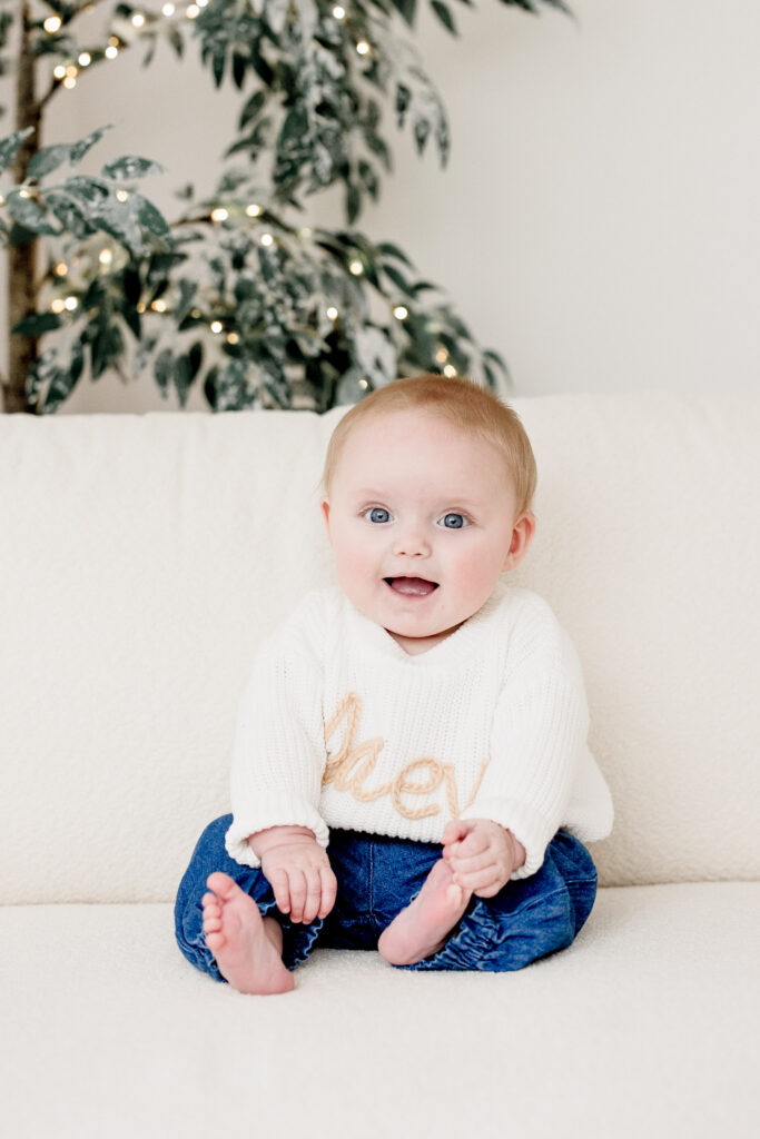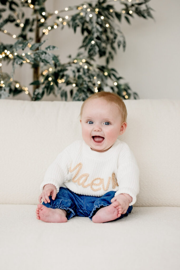 Take six months, for example. Babies at this age are bursting with personality—they’re smiling, giggling, and beginning to interact with the world around them. They may be learning to sit independently, playing with their toes (adorable for photos!), and giving you countless heart-melting smiles which I guarantee will bring years of joy as their hanging pride of place in your home.